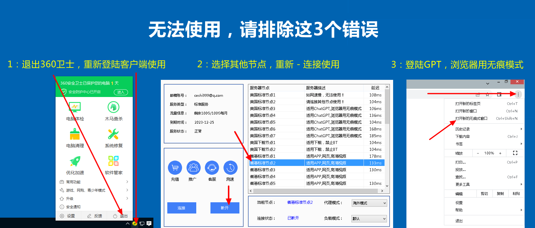 第2步:断开客户端,选择日本1,香港1等节点连接(避免当前节点无效)